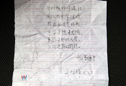 原来,这一切起源于安徽万通的红马甲志愿者的热情服务。16日,位于合肥市明光路汽车站的安徽万通的红马甲们一如既往地进行接站工作。这时,12技师2班的方文豪同学发现前面有一个老大爷刚下车,拖着重重的行李在毒辣的阳光下蹒跚而行。于是主动走向前去,一手帮老人拖起行李,一手搀扶着老人慢慢走向汽车站门口,在询问了老人的具体住址之后,帮老人打了车,把行李安放好。这一幕恰好被一个旅客看在眼里,于是大笔一挥写了上述的打油诗赠给方文豪同学,表扬他助人为乐的精神。