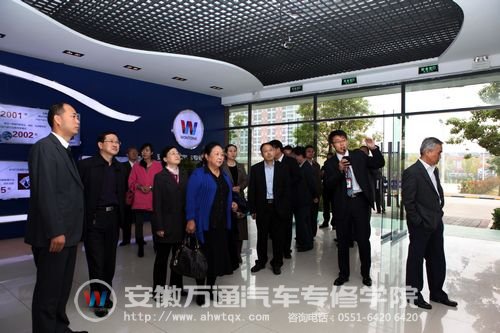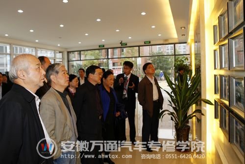在集团和院领导的陪同下,调研小组一行分别参观了安徽万通汽车专修学院的实训室和校史文化墙,讲解员对万通理实一体化的教学模式进行了深入的解说,规范的课堂秩序和实战实训的操作模式得到了领导小组的首肯。在看到万通学子自己动手组装的机器人后,领导纷纷掏出手机拍照,对万通学子的创新能力表示赞叹。在看到学生们身着不同的校服之后,领导们表示不解,在听了院校领导的解释之后恍然大悟,原来那是安徽万通共建班的“班服”,由企业提供,除了起到企业标识功能外,还集中展现企业文化,共建班的学生。