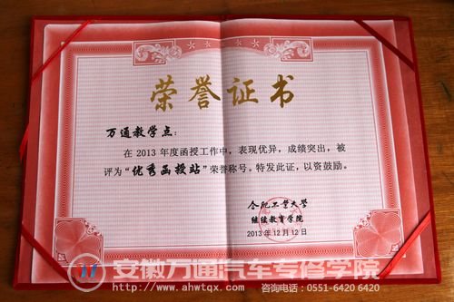近日,在合肥工业大学对各函授站(教学点)进行的质量监控和效果评估中,安徽万通汽车专修学院以其规范的管理、良好的办学声誉和高质量的教学水准荣获优秀函授点的称号。