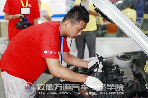 来自安徽万通汽车专修学院的周小勇和薛正文参加的是4-6万公里保养检查项目,两人凭借精湛的技能经历重重选拔作为安徽万通的学生队代表征战南京。经历赛前的磨合及集训之后,比赛现场俩人默契十足,配合得当,行云流水的操作和精干有力的汇报完美的配合成功吸引了现场观众的注意力。