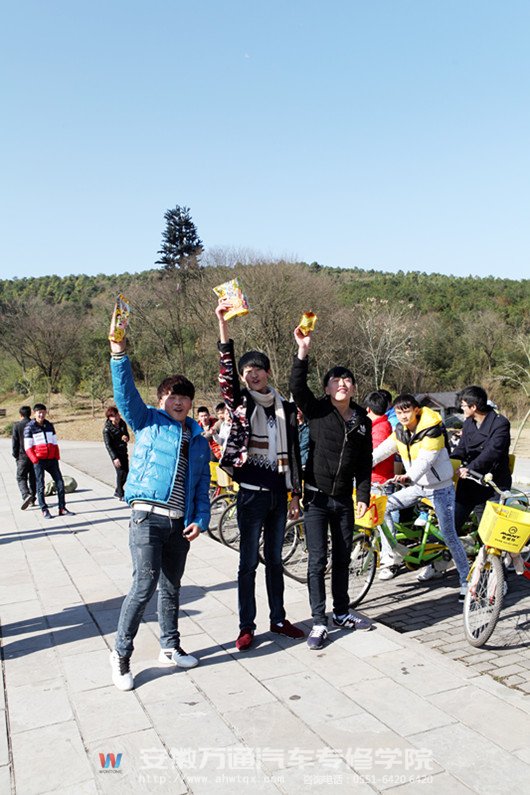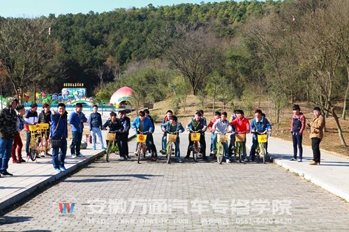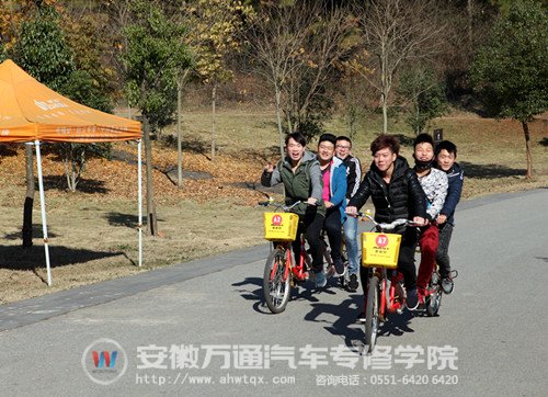 同学们三三两两骑着租来的自行车