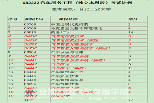 据安徽万通汽车专修学院服务中心程本武主任介绍,汽车服务工程专业自考本科主考院校为合肥工业大学,共13门考试计划,其中8门国考,5门校考,外加论文设计答辩。安徽万通汽车专修学院作为合肥工业大学高等教育自学考试学习服务中心,在校生享有中国近现代史纲要(课程代码03708)、马克思主义基本原理概论(课程代码03709)两门国考课程免考权利,学校还将在后期的校考中作为考点迎接各方考生。