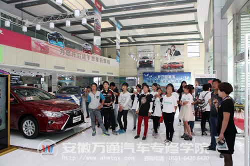 在参观校园结束后,同学们来到与安徽万通合作的广汽中宝丰田4S店里参观体验,在咨询师的下,同学们参观了4S店的维修、喷涂、美容车间,近距离了解汽车维修师的工作日常。广汽中宝丰田4S店的工作环境被涡阳地区的学生赞为“高大上”,各种的维修器材让同学们应接不暇。