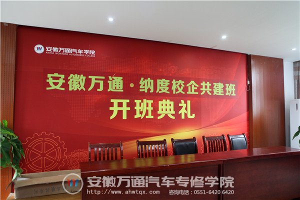 2017年4月10日,安徽万通与纳度校企共建班开班典礼在我院隆重举行,安徽万通汽车专修学院副院长廖光宙等校领导出席典礼。本次共建班的正式开班,标志着我院取得了新的成绩,并开通一条更加顺利的就业渠道。