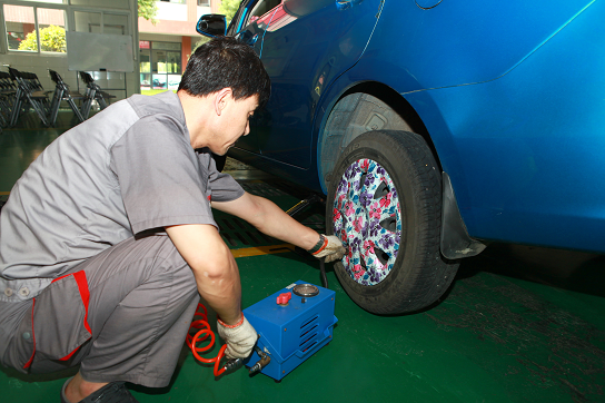 汽车检测换氮气之前要检测轮胎的气压是否正常,并且要先排空轮胎内原先填充的气体。汽车轮胎检测是换气之前的一个重要操作,这样有助于确保接下来轮胎换气的安全性。安徽万通全能型教师时海峰老师熟练地操作起气压检测设备,确定轮胎气压的正常指数后,再进行排气换气的操作。