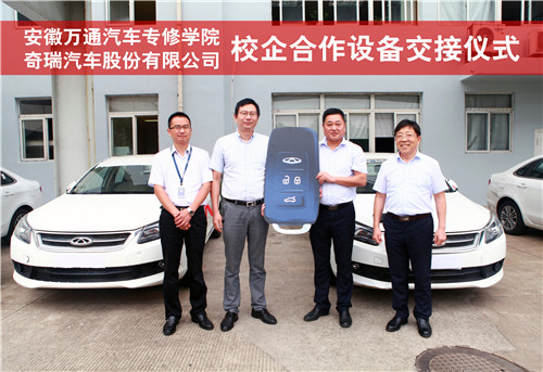新学期,新气象,万通学子又有新车实训啦。2017年9月6日,安徽万通与奇瑞汽车在奇瑞大学举行了教学设备交接仪式。奇瑞汽车股份有限公司人力资源部部长周明、奇瑞汽车大学校长毕全国及安徽万通汽车专修学院院长葛孝良、副院长廖光宙、创就业指导中心主任李杨等领导出席了本次交接仪式。