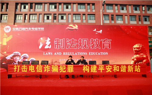 安徽万通汽车专修学院此次举办的安全法制讲座,以“打击电信诈骗犯罪”为主题,赵警官在讲座中以自身的办案经历为基础,讲述了一些发生在学生身边的真实案例,并从犯罪分子的违法行为、类型和危害着手,警醒师生们加强防范意识,号召大家知法懂法守法,严格遵守国家法律和校规校纪。