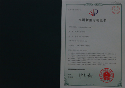 由杨久柱、项良法老师自主研发的“一种多功能汽车教学台架”获得国家知识产权局的发明专利授权(专利号ZL201720220068.X)。