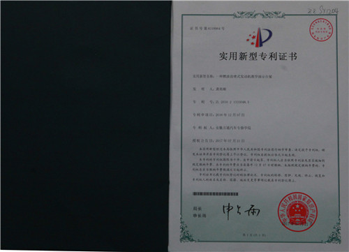由龚英顺老师自主研发的“一种燃油直喷式发动机教学演示台架”获得国家知识产权局的发明专利授权(专利号ZL201621333048.5)。