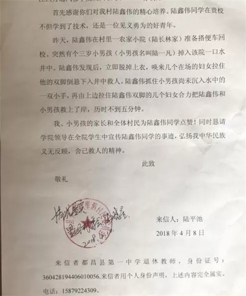 4月7日,正是陆鑫伟19岁生日,他正在整理清明小长假后回校的行李,这个时候突然一声“有人落水了”的呼救声传来,他和他姐姐马上沿着声音跑去,原来一个两岁的小朋友玩耍的时候不小心掉进了水井中,情况十分危险。陆鑫伟没有多想,当即让姐姐拉住他的脚毫不犹豫的将整个身体都探进了井里,要知道这个井沿到井面离的足足有两米,而陆鑫伟的身高才1米6多,其中的危险不言而喻。但万幸的是,在陆鑫伟和姐姐的配合下,孩子顺利得救了。事后问到陆鑫伟你当时害怕么?他只是笑笑:“当时真没想这么多,就想快些、再快些,把小孩救出来”。