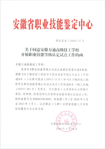 4月10日,安徽省职业技能鉴定中心正式发函,经评审组专家评定,我校顺利通过备案评审,成为安徽省首批职业技能等级认定试点单位,具备了自主开展职业技能等级认定的资格,颁发的认定证书与国家职业资格证书具有同等效力,可以面向全社会开展机动车鉴定评估师职业技能等级认定工作。去年12月31日,人力资源和社会帮助部发布首批职业技能等级认定第三方评价机构名单,安徽新华教育集团成为国家首批职业技能等级认定第三方评价机构。国家职业技能等级认定第三方评价机构是人力资源和社会帮助部认可的、在行业内有着领先地位和公信力的单位机构。