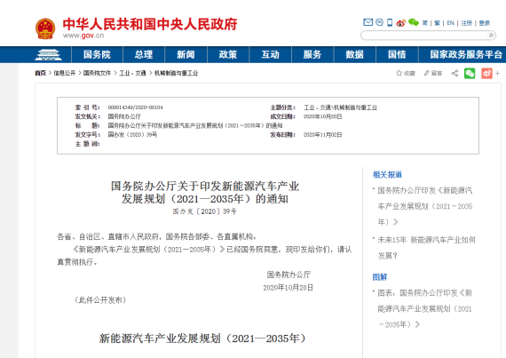 11月2日傍晚,国务院办公厅印发《关于印发新能源汽车产业发展规划(2021-2035 年)》(下称《规划》,在发展愿景中指出:到2025年,我国新能源汽车市场竞争力明显增强,新能源汽车新车销售量达到汽车新车销售总量的20%左右。到2035年,纯电动汽车成为新销售车辆的主流,公共领域用车全面电动化,燃料电池汽车实现商业化应用,高度自动驾驶汽车实现规模化应用,有效促进节能减排水平和社会运行效率的提升。