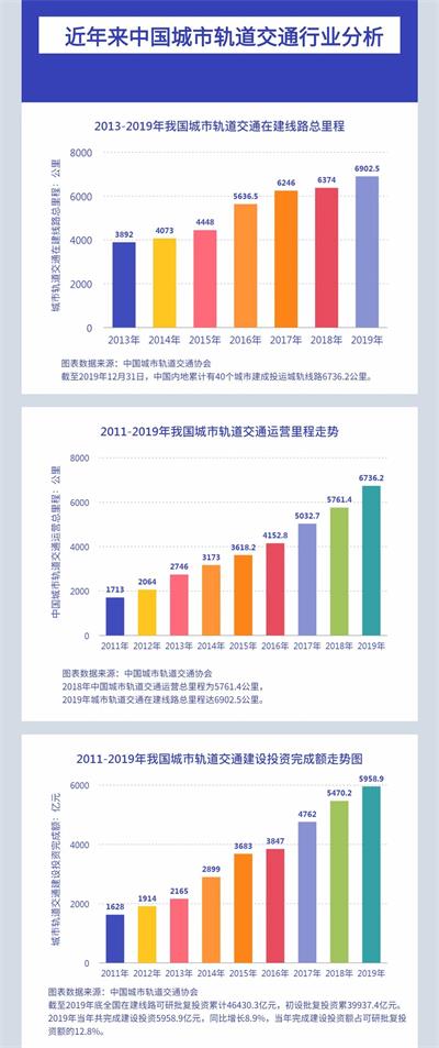 数据显示:截至2019年12月31日,中国内地累计有40个城市建成投运城轨线路6736.2公里。2018年中国城市轨道交通运营总里程为5761.4公里,2019年城市轨道交通在建线路总里程达6902.5公里。