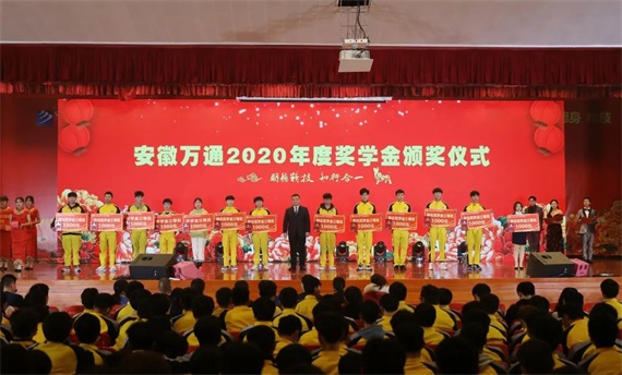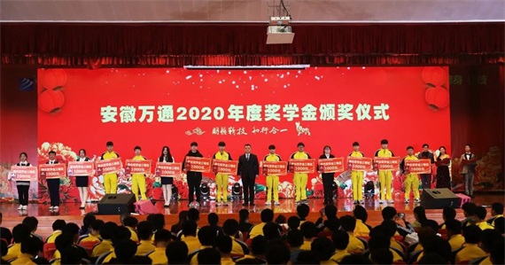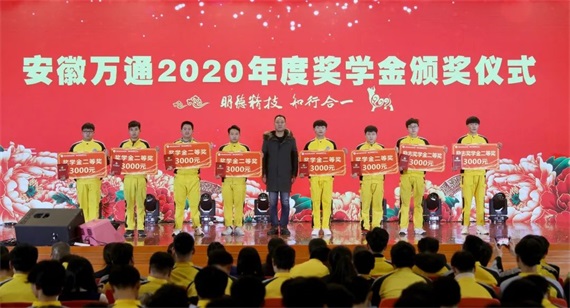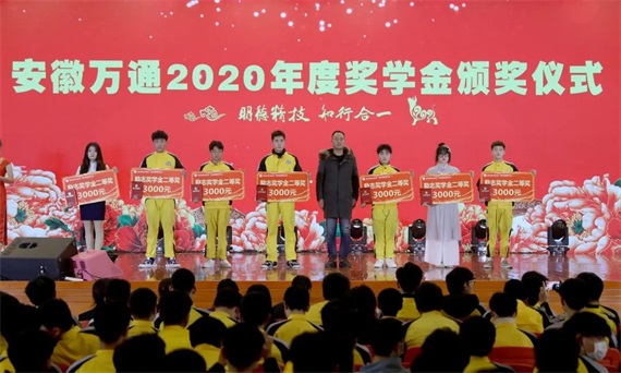 此时节目已快到了尾声,又到了颁奖环节。安徽万通考证中心主任沈海红为大家宣读了“关于表彰2020年国家奖学金合肥市中等职业教育学生奖学金和励志奖学金获奖通知”。安徽万通高级技工学校校长陈成、副校长廖光宙、校长助理许田、校区主任张庆分别上台为获奖学生颁奖。