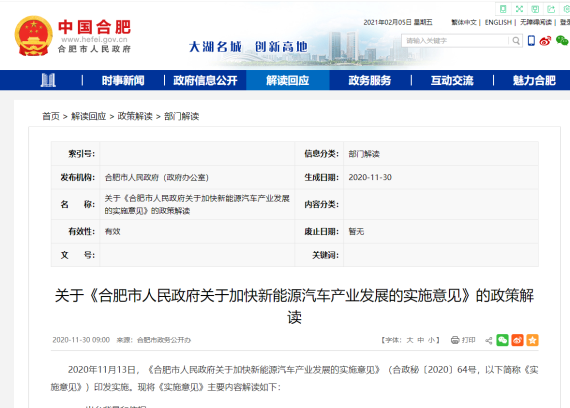 另外,合肥市政府曾出台《关于加快新能源汽车产业发展的实施意见》,明确指出到2025年,合肥市新能源汽车整车以及动力电池、驱动电机、车载操作系统等关键技术要达到国际先进水平。
