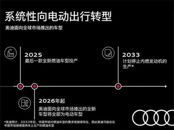 不久前,奥迪首席执行官杜斯曼向公司高管宣布,由于全球节能减排压力,为了减少公司研发支出,计划将在未来五年时间内逐步减产汽油、柴油车的生产和销售,2026 年以后投放市场的新款车将全部为纯电动汽车(EV)。汽油和柴油发动机将在 2025 年之前停止开发,2033 年将停止销售燃油车。