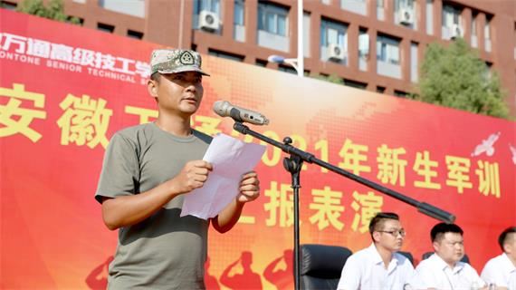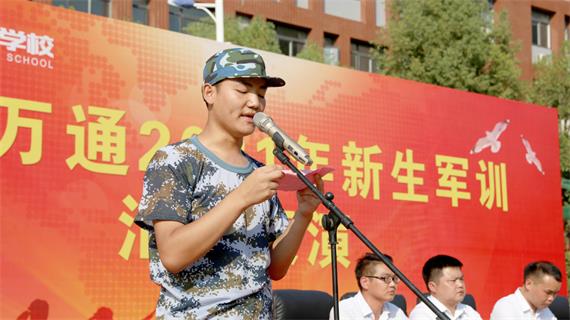 军训表彰结束后,军训优秀学生代表洪博文上台发言,他表示,在这9天的军训中,他对安徽万通有了进一步的了解,校园环境的优美,管理制度的严谨,老师的和蔼可亲,同学间的互助友爱,都让他在这个陌生的环境中感受到温暖,在这里使他们的人生又翻开了新的篇章。
