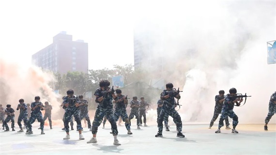 队列表演、军体拳--中国军魂、战术--渴望光荣、手语操--勇往直前、格斗组合拳--男儿当自强、大合唱--我和我的祖国等方队展现了他们的军训成果。9天的努力都在这一刻绽放绚丽的色彩,让我们为青春拼搏的万通新生喝彩!