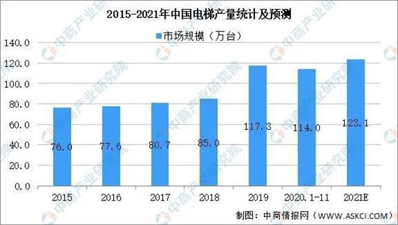 近年来,在房地产、轨道交通建设、机场改建扩建等的投资带动下,我国电梯产业得到了快速发展。目前我国已成为全球最大的电梯生产国和消费国,截止到2020年11月,我国电梯产量114.0万台,预计2021年电梯产量可达123.1万台。