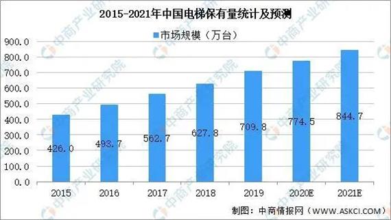 与电梯产销量快速增长相匹配,我国电梯保有量持续增加,未来电梯更新市场及售后服务市场空间巨大。根据国家市场监督管理总局数据,截至2019年末,全国共有注册在用特种设备电梯709.75万台,居世界首位。预计在2021年电梯保有量将可达844.7万台,巨大的电梯保有量将为电梯维保市场和更新市场带来极大的发展空间。