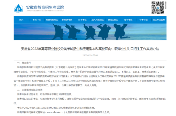 近日,安徽省出台了《2022年高等职业院校分类考试招生和应用型本科高校面向中职毕业生对口招生工作实施办法》(以下简称办法),《办法》中对分类考试招生与对口招生的报名条件、报名时间、考评方式、录取方式等内容做了详细的介绍。