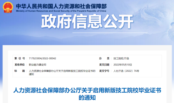 技工院校毕业证书是技工院校对学业期满、思想品德合格、完成规定的全部课程且成绩合格学生颁发的毕业凭证。新版毕业证书(证书样式见附件1)在保持技工院校毕业证书管理体系、证书编号规则、证书印制与颁发管理流程、证书质量要求等方面不变的基础上,根据技工教育事业发展需要,对证书中部分内容进行了适当的调整完善。新版技工院校毕业证书将于2022年9月1日起正式启用。