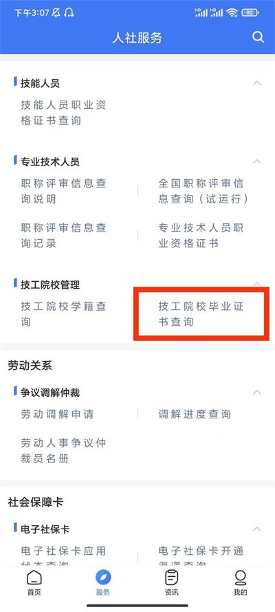 3.掌上12333APP/12333小程序,“服务”-“人才人事”-“技工院校管理”-“技工院校毕业证书查询”