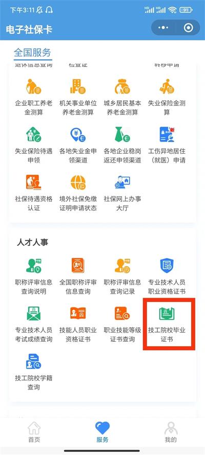 4.电子社保卡小程序、电子社保卡服务渠道,“全国服务”-“人才人事”-“技工院校毕业证书”
