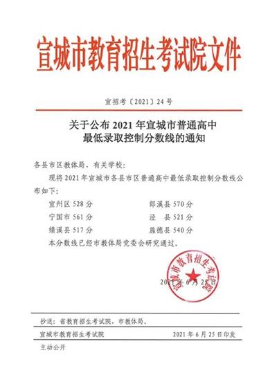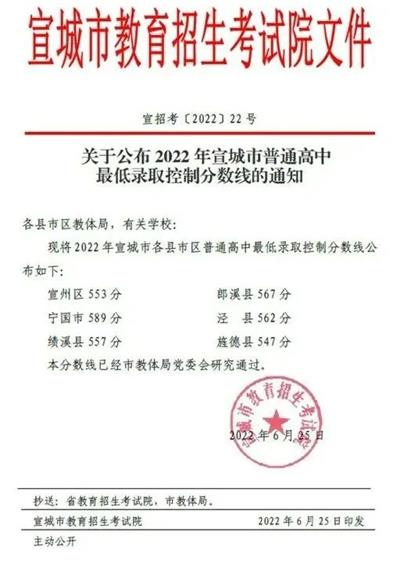 2022年宣城市中考成绩已经公布,各县市区普通高中录取控制分数线也出炉!对比2021年数据,多县市出现分数线上涨现象,最高上涨41分!