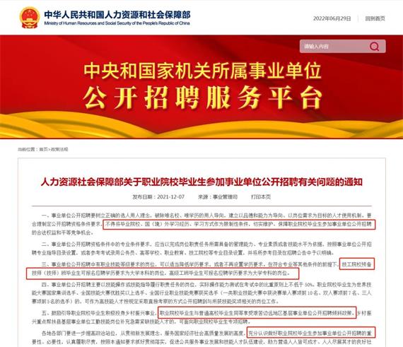《通知》要求,事业单位公开招聘要树立正确的选人用人理念,破除唯名校、唯学历的用人导向,切实维护、保障职业院校(含技工院校)毕业生参加事业单位公开招聘的合法权益和平等竞争机会。