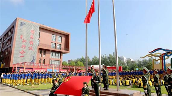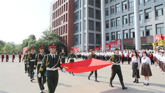 伴着激昂的出旗曲,国旗护卫队的护旗手们气宇轩昂地迈向旗台,升旗手伴着雄壮的《义勇军进行曲》,在全校师生的注目之下,把国旗缓缓升起,鲜艳的五星红旗迎风飘扬,对党、对祖国的热爱和自豪油然而生。