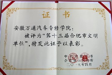 近日,安徽万通汽车专修学院顺利通过合肥市文明委复检组的复查验收,被合肥市委、市政府授予“第十三届合肥市文明单位”荣誉称号。