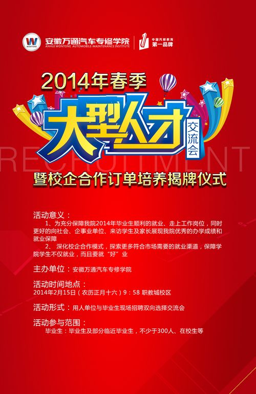安徽万通春季大型人才交流会暨校企订单班揭牌仪式,时间:3014年2月15日上午09:58(农历正月十六),地点:安徽万通职教城校区。安徽万通欢迎所有即将毕业、毕业待就业的学生前来参会应聘,同时欢迎各大汽车服务公司前来参展招贤纳士。